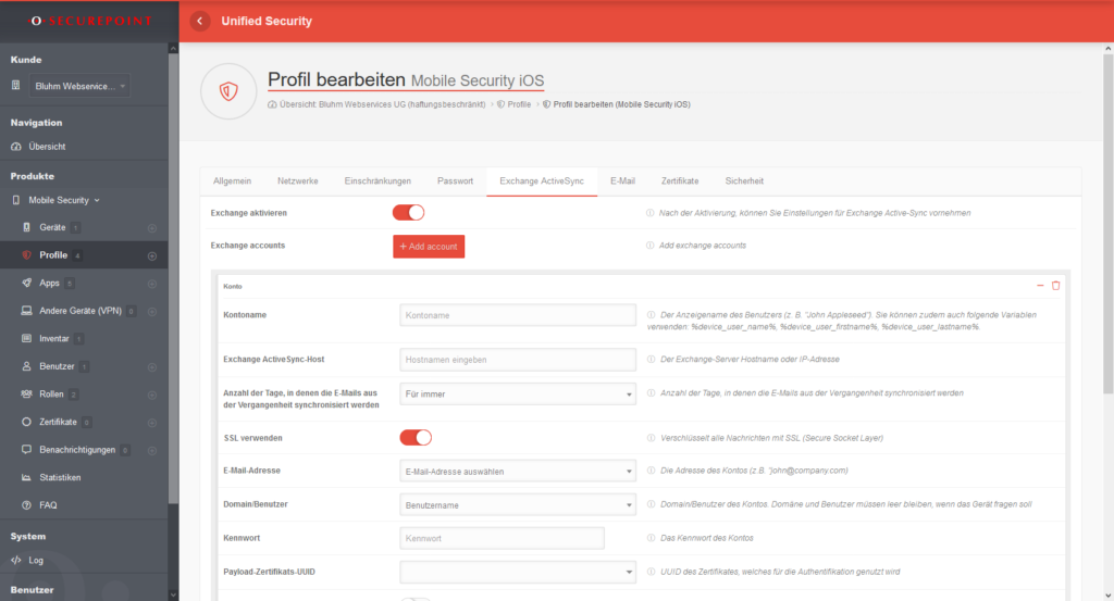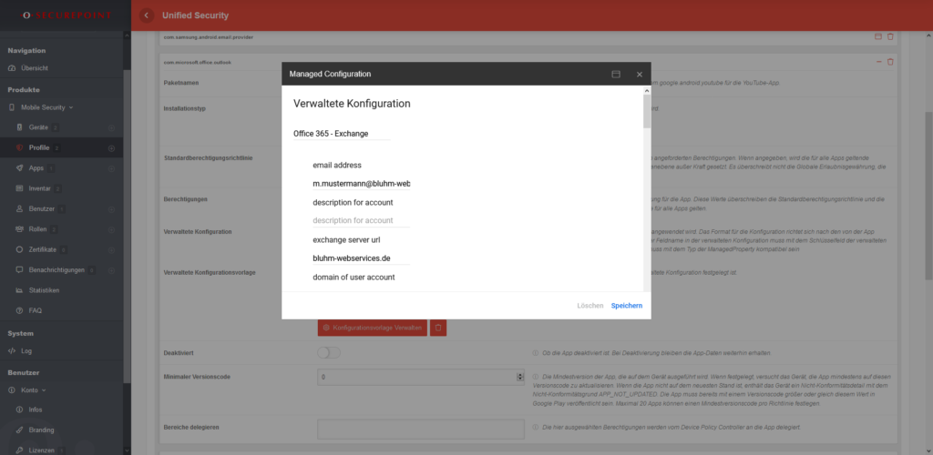Häufig möchte man nicht nur verschiedene Apps installieren, sondern auch gleich die richtigen E-Mail Konten hinzufügen. Mit der MDM-Lösung von Securepoint können Sie das natürlich auf Android und Apple Geräten.