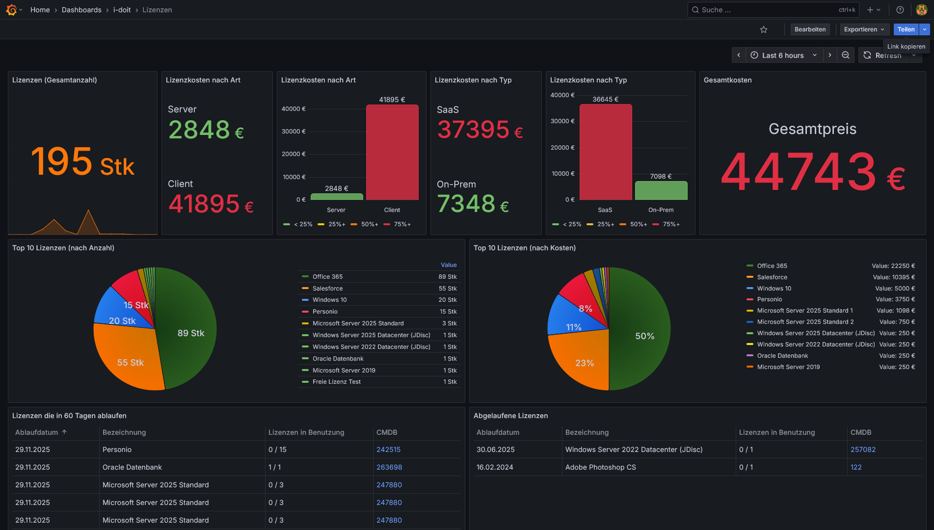 Stellen Sie die Daten aus i-doit in Dashboards zusammen und berechnen Sie Kennzahlen, Ausgaben und Nutzungsdauern.