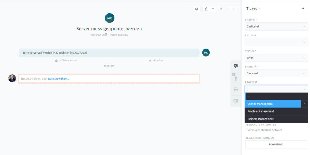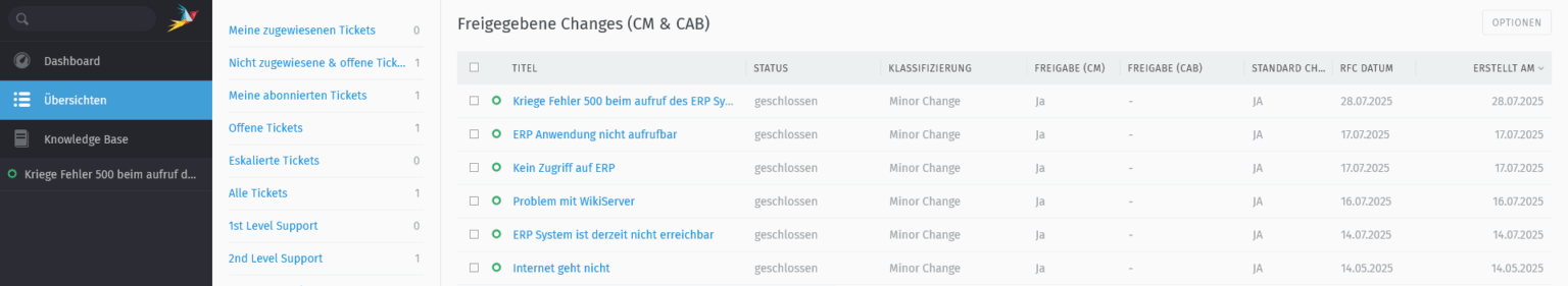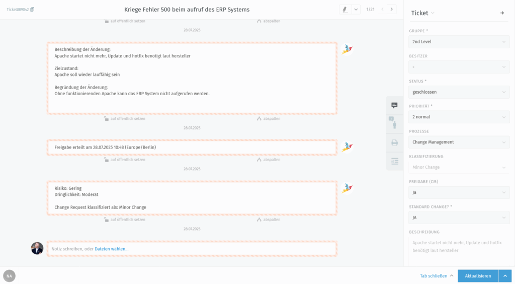 Changes und Freigaben werden direkt im Ticket erfasst und über berechtigte Rollen gesteuert.